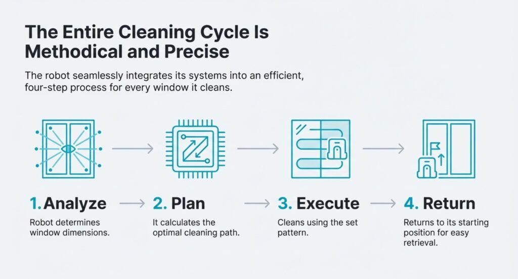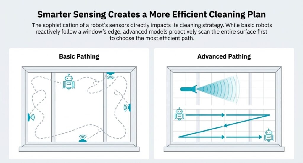 Basic robots just follow the window’s edge first. Smarter ones scan the whole surface before picking the best cleaning path.