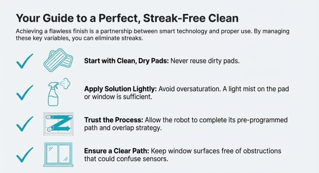 To avoid streaks, you need to prep the glass, use the right cleaner, keep pads clean and damp, and pick the right robot settings for your windows.