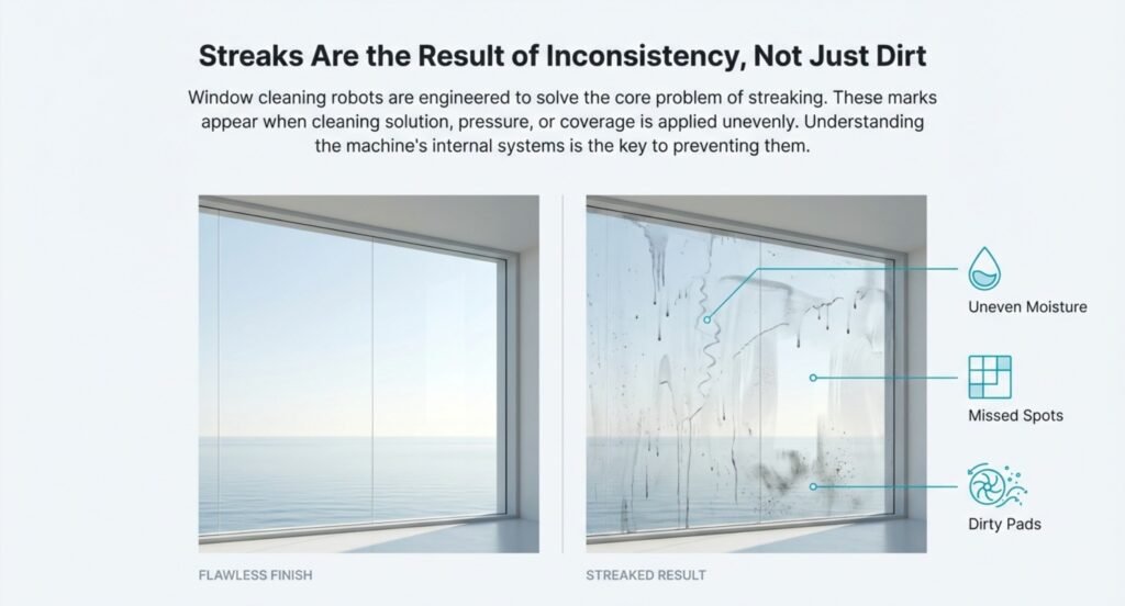 Streaks happen when the cleaning solution dries unevenly or the robot’s pads leave stuff behind. Honestly, it’s not that different from what happens if you use too much cleaner or wipe in weird directions by hand. Robots just add their own issues, like how wet the pads get and how they move across the window. That mix of moisture + movement is why the window cleaning robot streaks problem can look worse on sunny windows or glass with light dust.