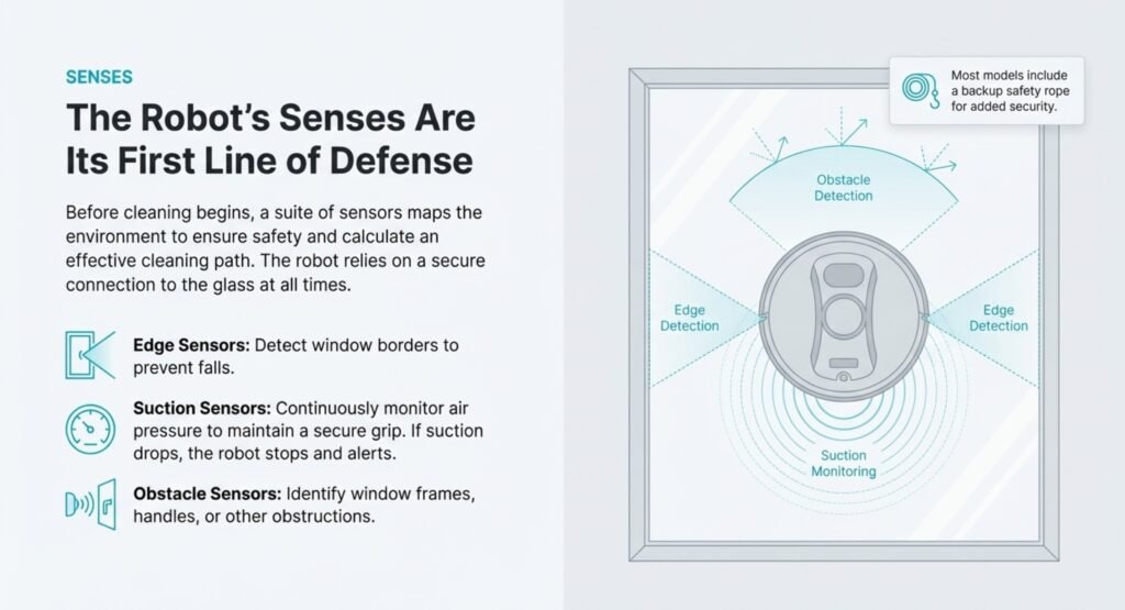 Suction sensors keep an eye on air pressure. If suction drops, the robot stops and grabs on tighter. Many models also have a backup safety rope, just in case.