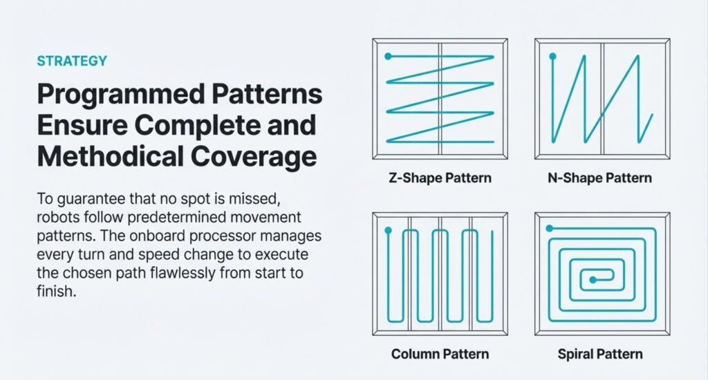 Robots follow set patterns so they don’t leave streaks or miss spots. The most common is a Z-shape or N-shape, moving in overlapping rows. This helps make sure every bit gets cleaned more than once.